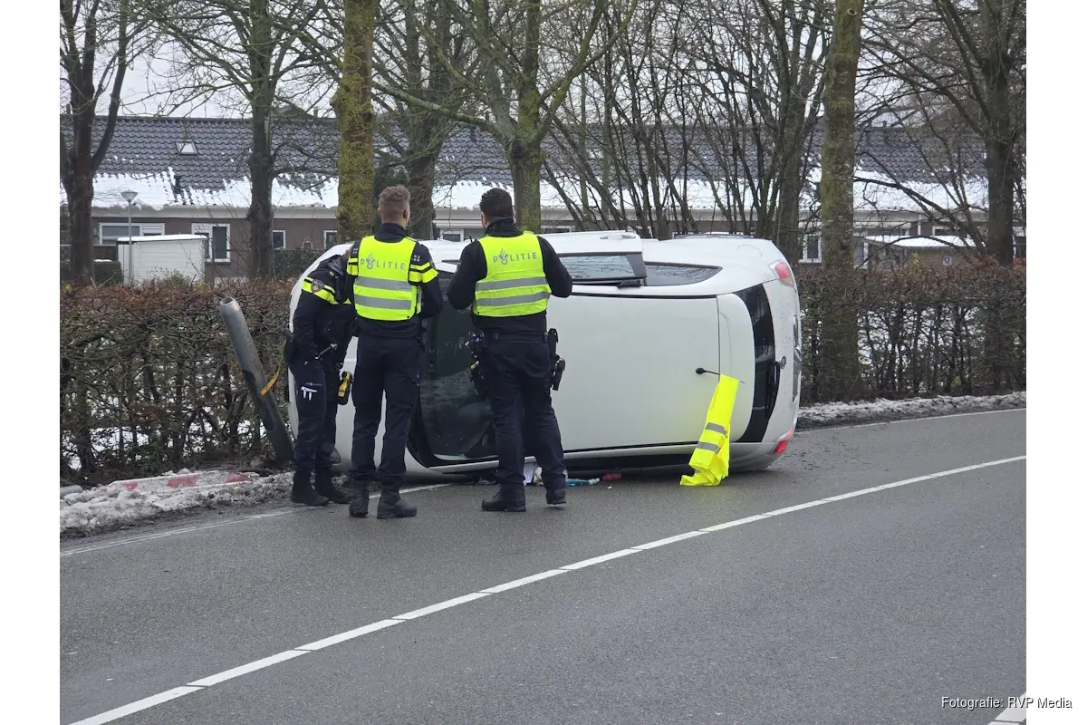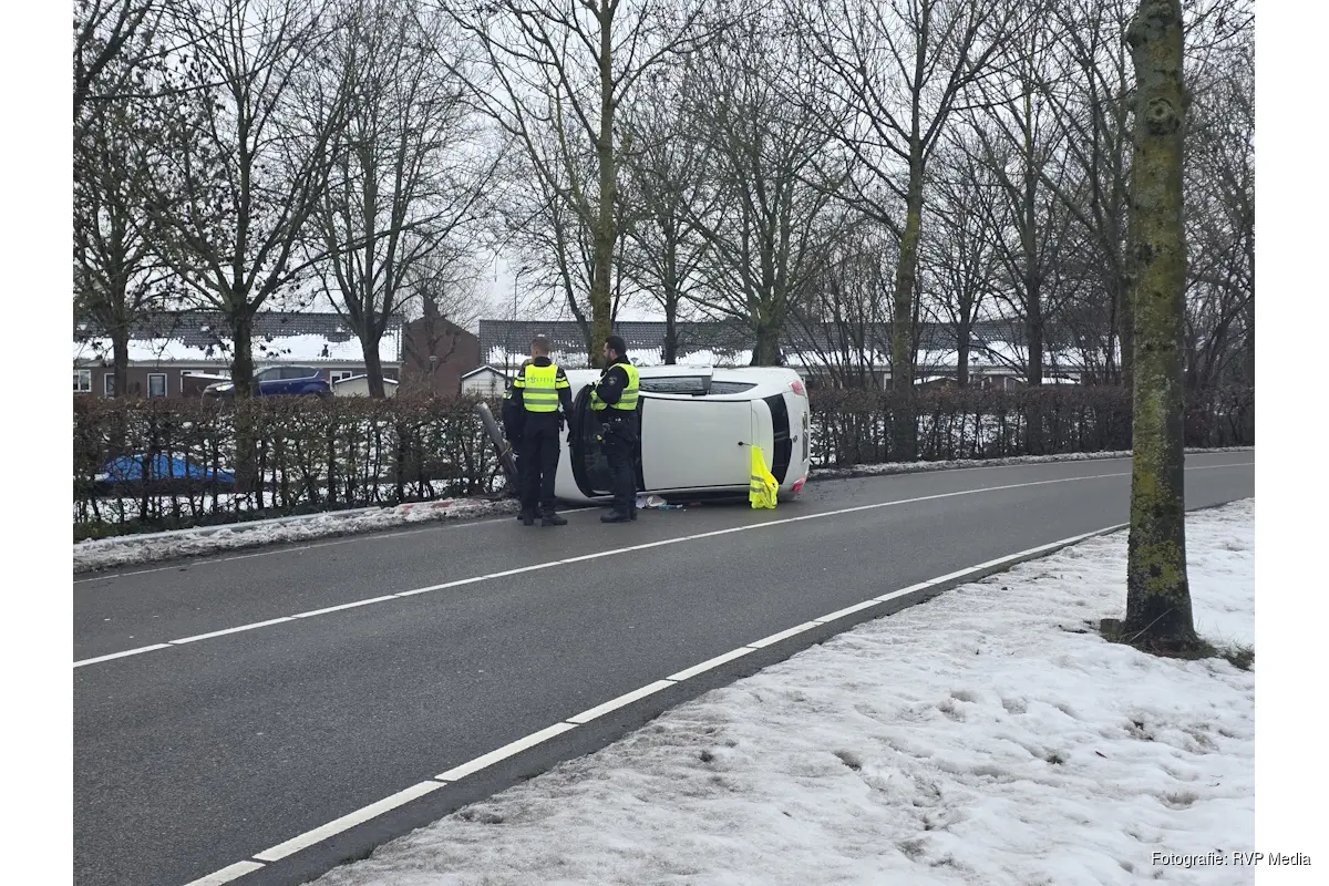 Een automobilist verloor door nog onbekende oorzaak de controle over het stuur en botste tegen een lantaarnpaal, waarna het voertuig op zijn kant tot stilstand kwam.
