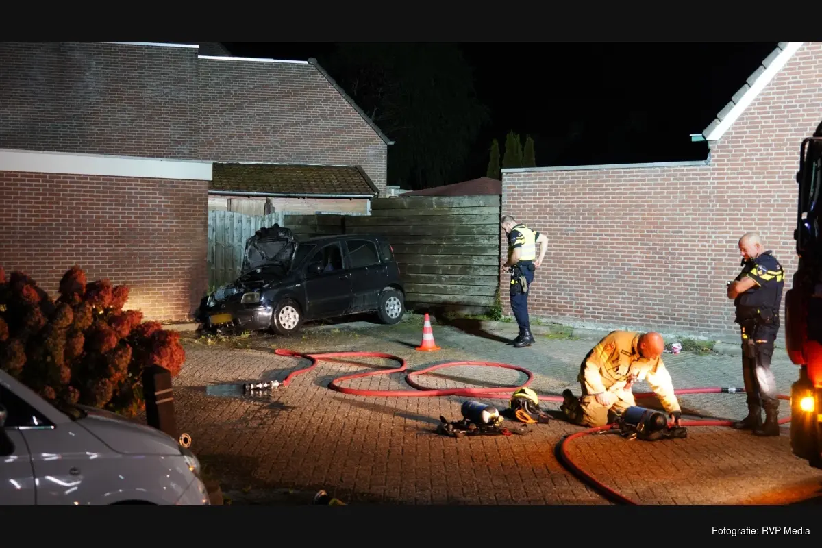 Bij aankomst van de brandweer stond de rechtervoorkant van een personenauto volledig in brand. De personenauto stond geparkeerd naast een garagebox.