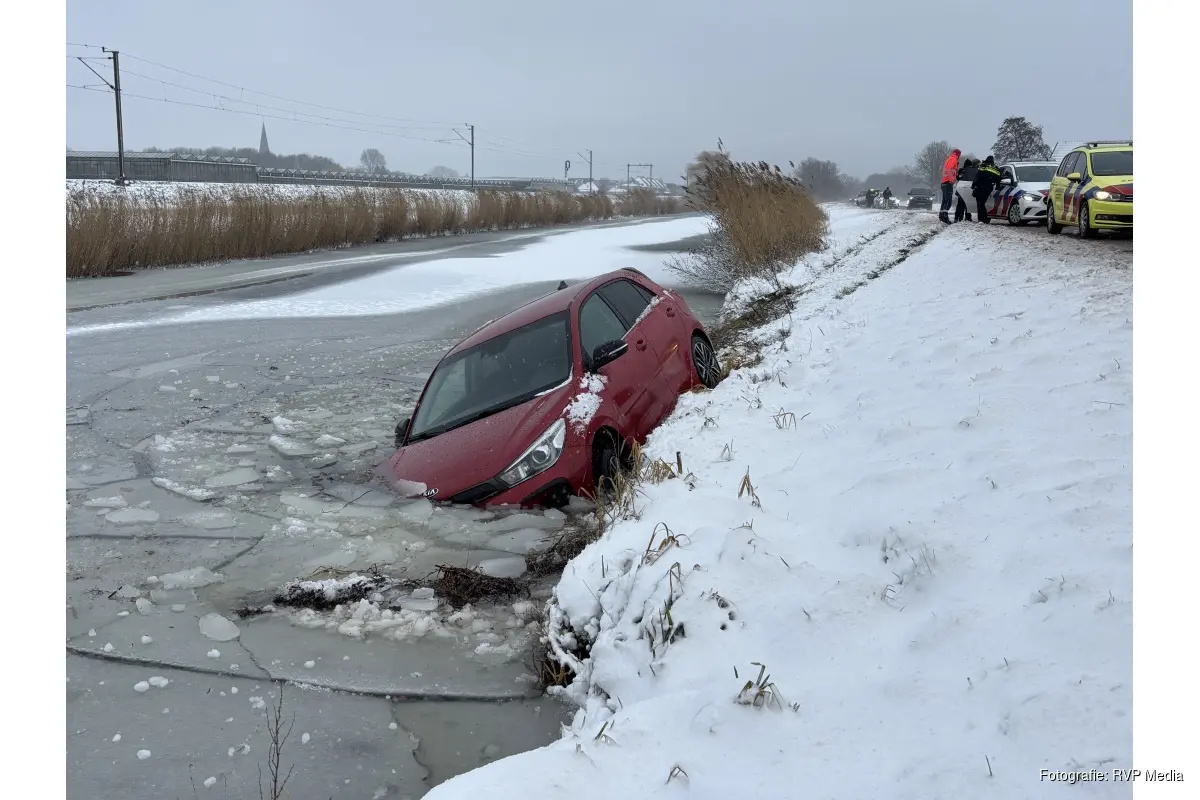 De bestuurder verloor door de sneeuw en gladheid de macht over het stuur en raakte te water. Hij kon zelf de auto verlaten en werd door de ambulancedienst behandeld. Een rit naar het ziekenhuis bleek niet nodig.