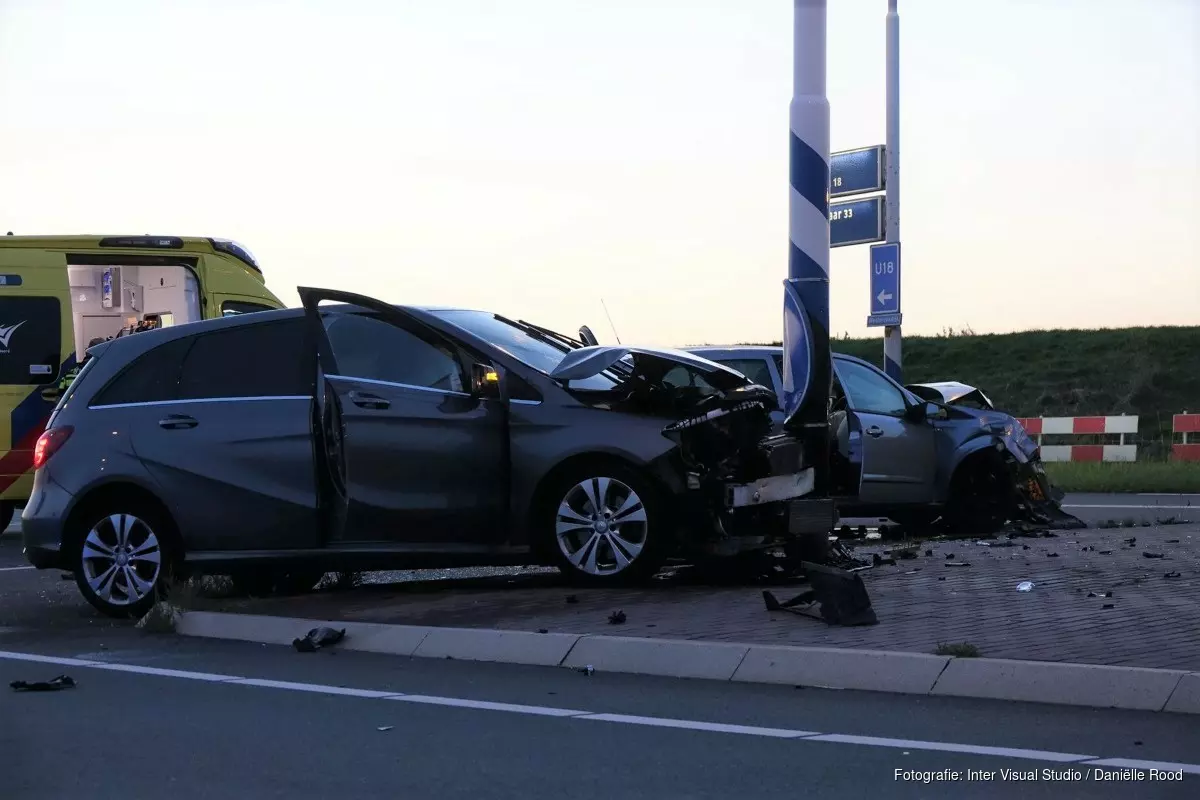 Eén van de betrokken voertuigen kwam na de botsing tot stilstand tegen een verkeerspaal. Twee personen raakten gewond en zijn met onbekend letsel naar het ziekenhuis gebracht.