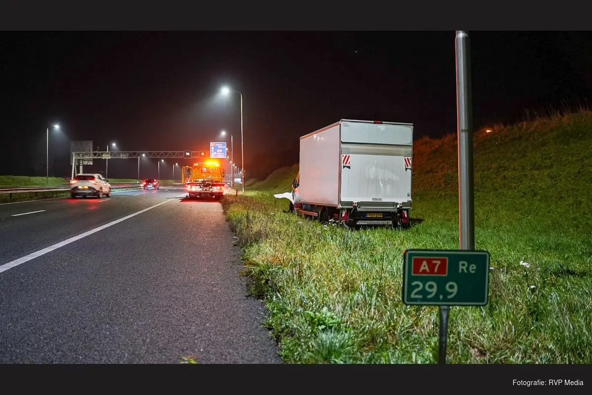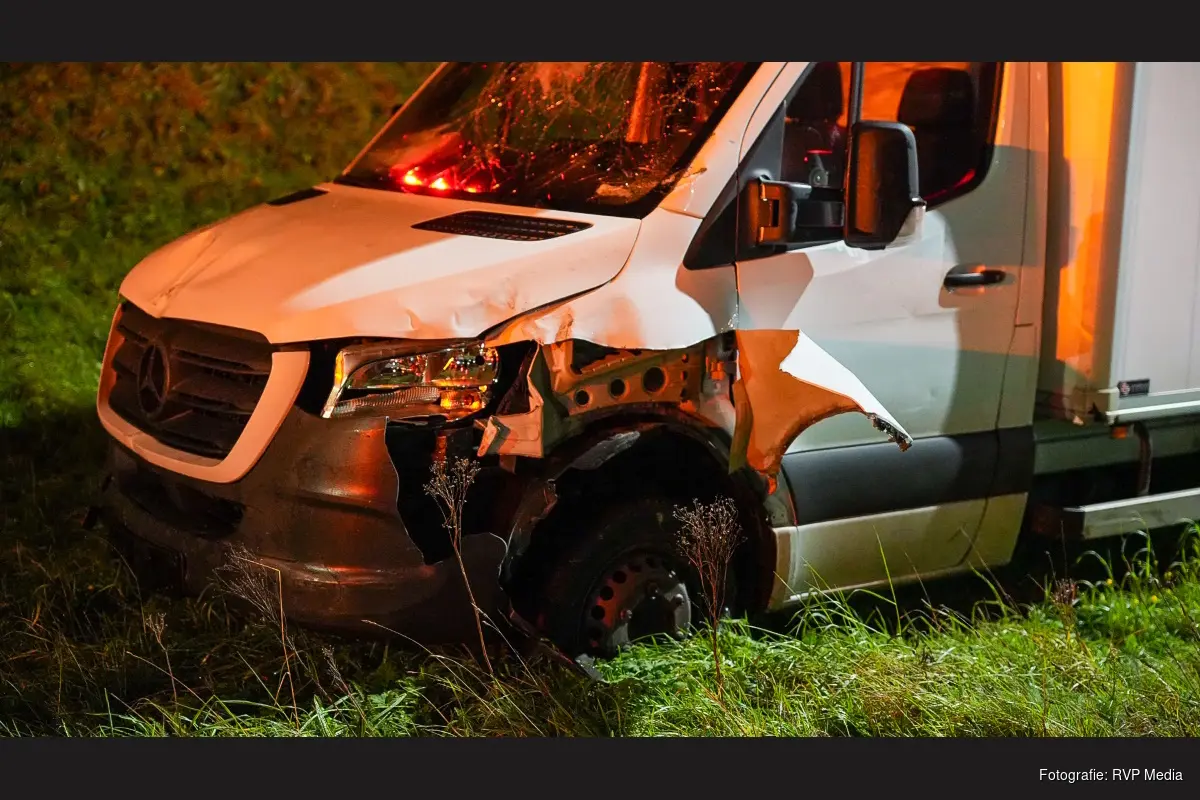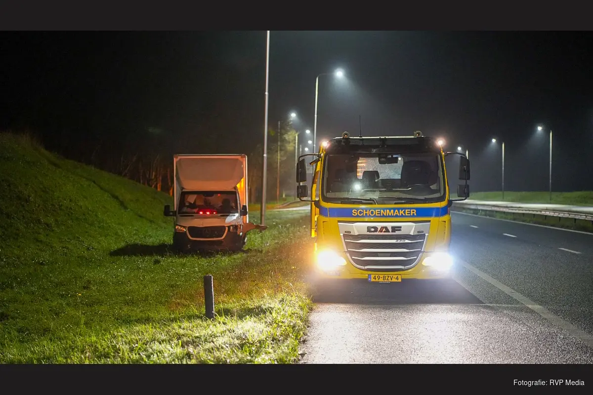 Een bergingsbedrijf heeft de beschadigde bakwagen uit de berm getrokken en afgesleept. De bestuurder raakte niet gewond.