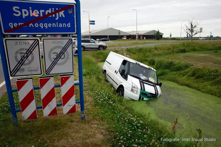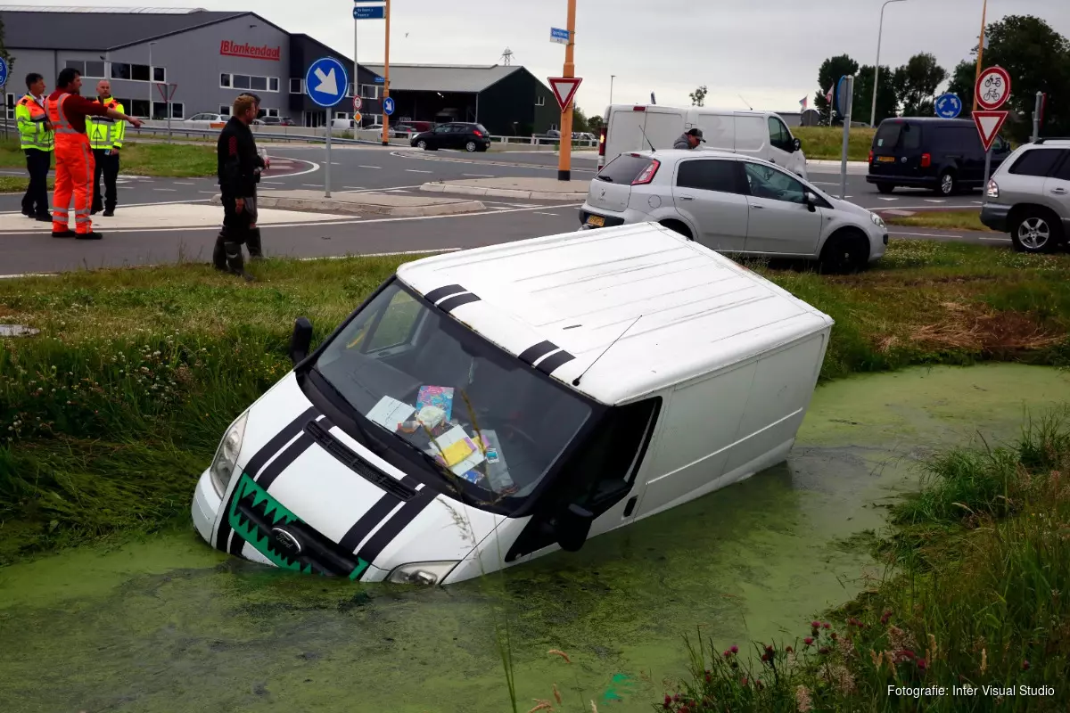 Vermoedelijk heeft de bestuurder van de bedrijfswagen even niet op gelet en is zo in het water is beland. De bestuurder kwam er met een nat pak vanaf.