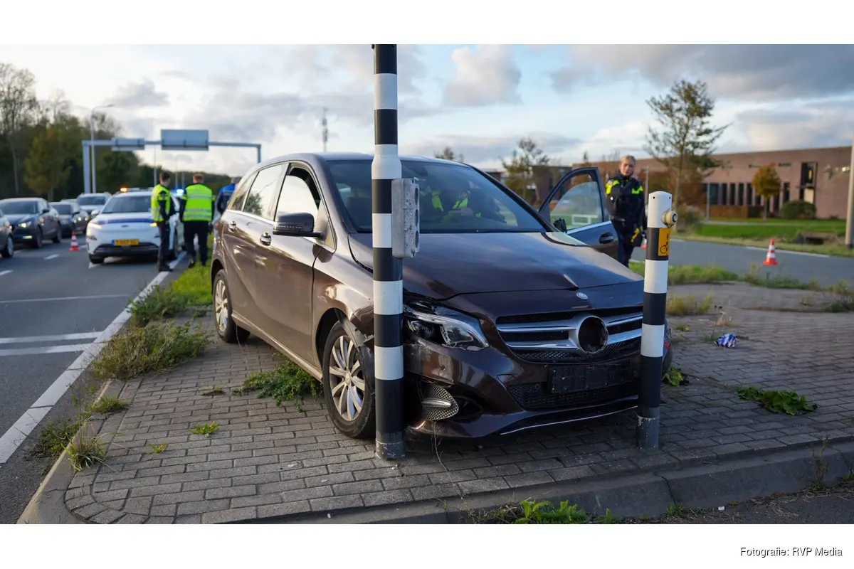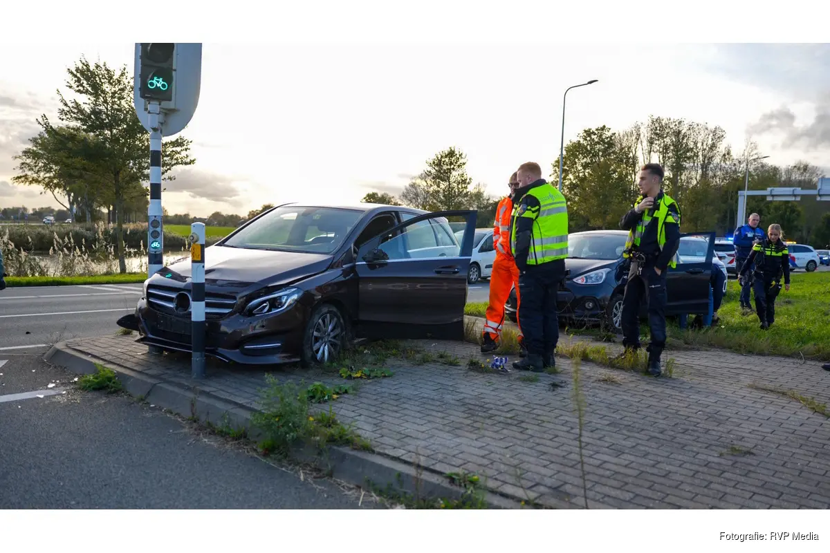 Twee voertuigen botste door nog onbekende oorzaak achterop elkaar bij de stoplichten. Een van de voertuigen botste vervolgens tegen de stoplichten bij het fietspad. De bestuurder van de bruine Mercedes is door de ambulance met spoed overgebracht naar het ziekenhuis.