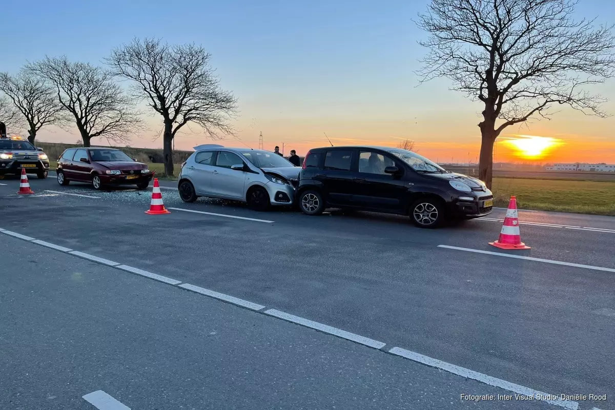 Daar zijn drie auto's op elkaar gebotst met de nodige materiele schade. Door de avondspits was het druk en werd het verkeer via het fietspad omgeleid.