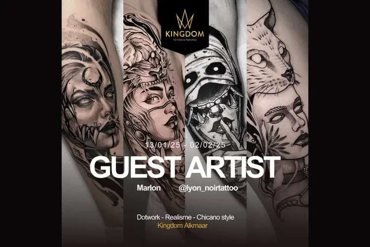 Van maandag 13 januari t/m 2 februari is Marlon (@lyon_noirtattoo) aanwezig bij Kingdom Alkmaar.