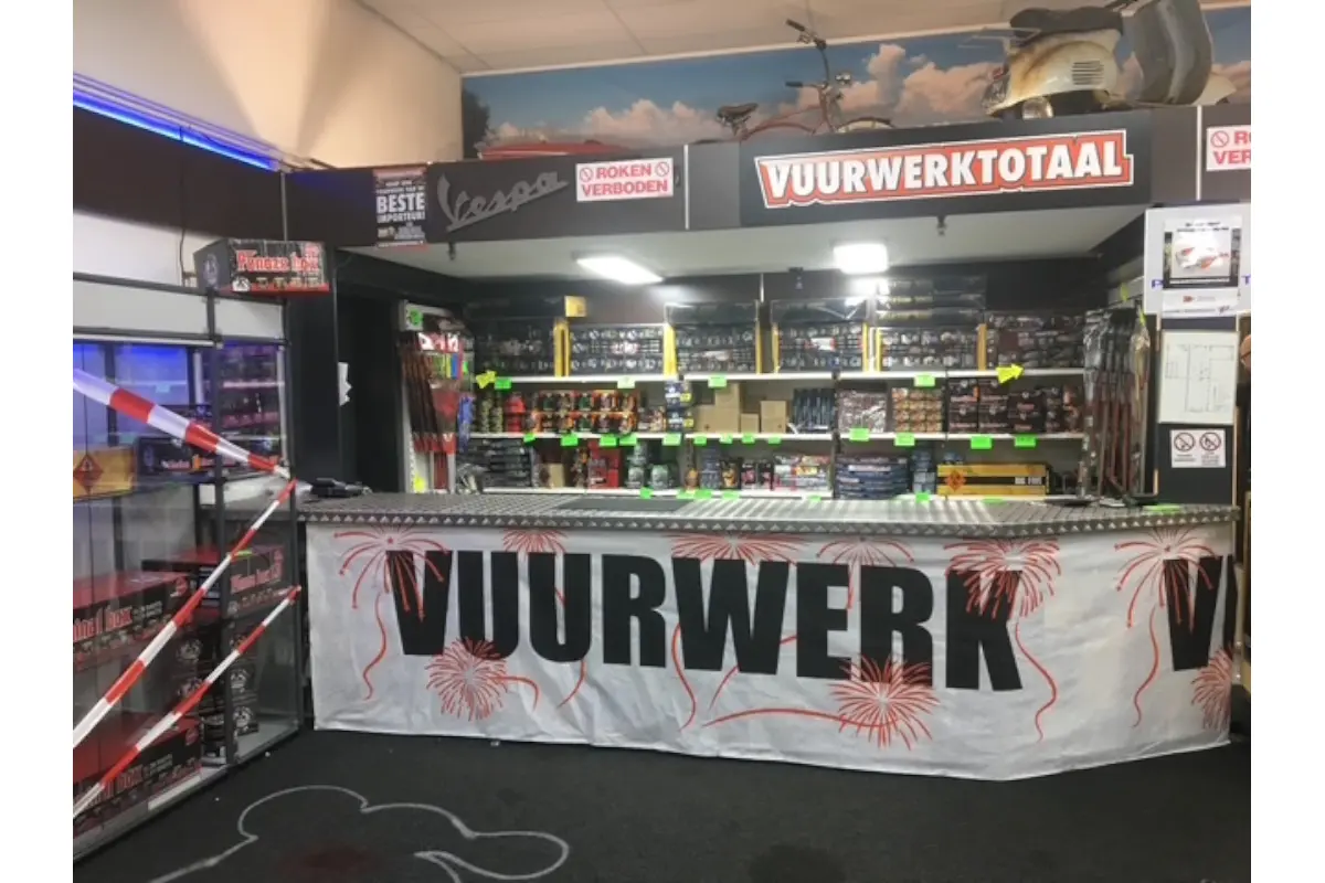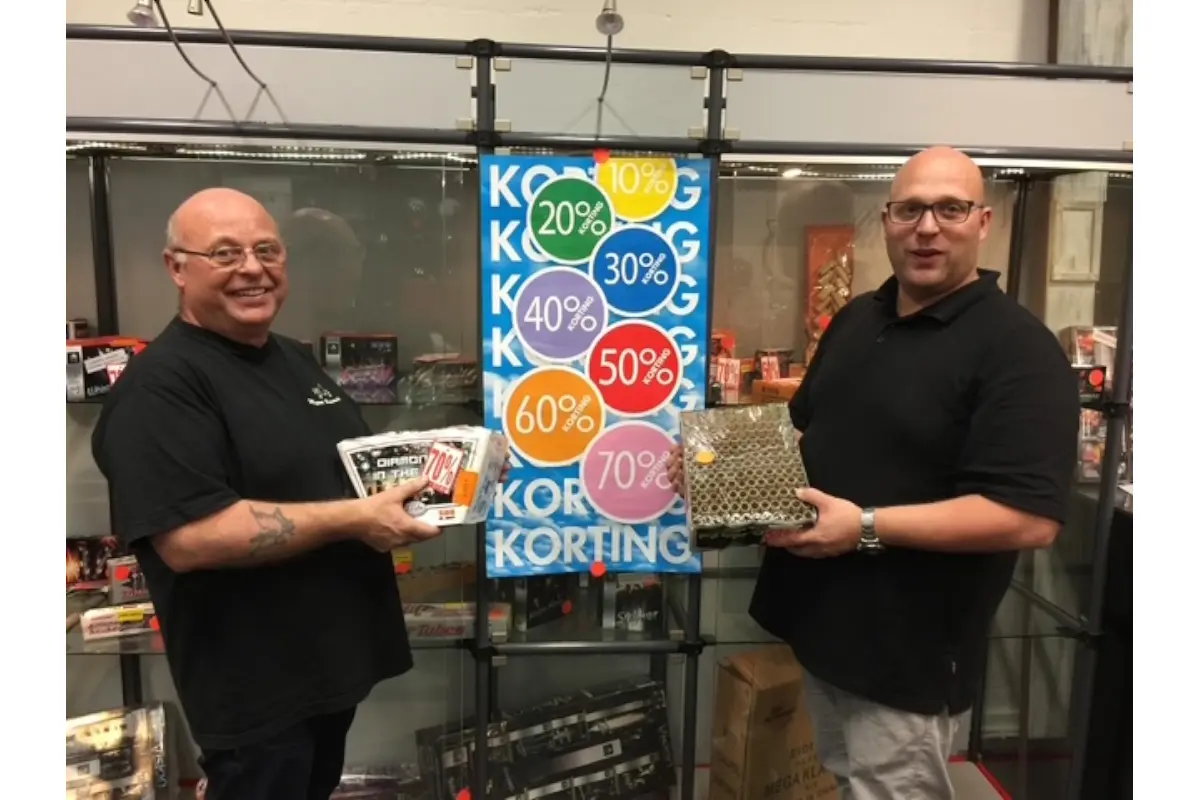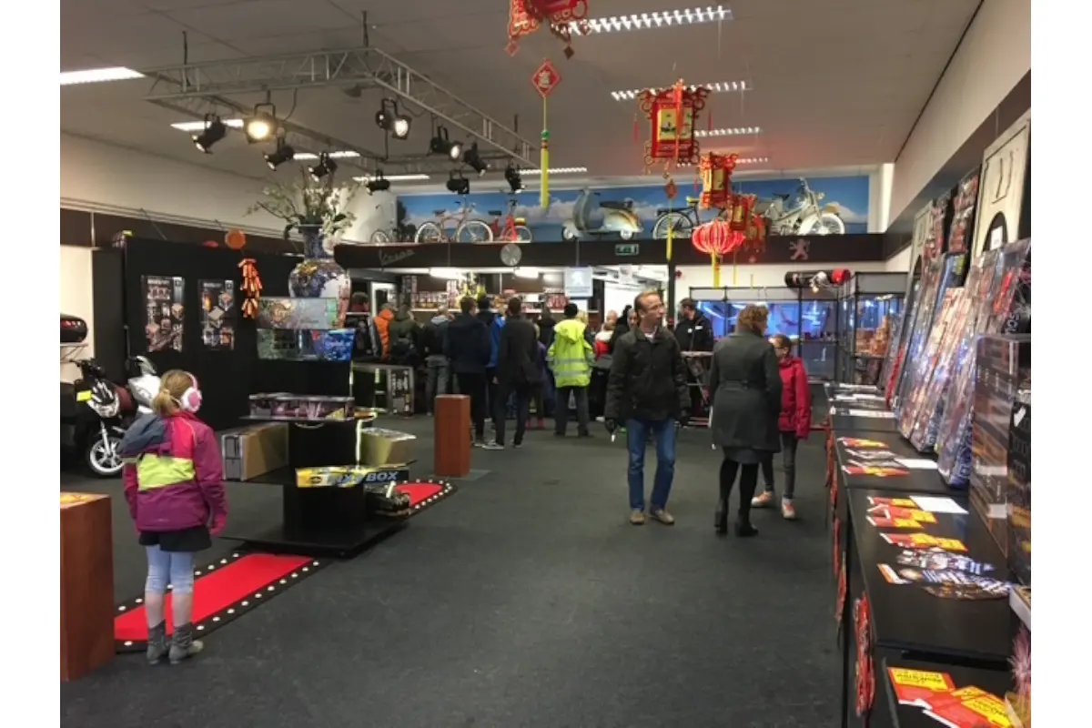 Niet veel later verhuisden we met de scootershop naar De Oude Veiling. Daar bouwden we professionele vuurwerkbunkers, compleet met sprinklers en brandmeldinstallaties. Ieder jaar groeide de vuurwerkverkoop, en aan het einde van het jaar werd het steeds weer een groot en gezellig spektakel. Meer dan 25 jaar lang stonden broers, neven, ooms, tantes, nichten, vrienden en natuurlijk de directe familie schouder aan schouder klaar om er een feest van te maken. Hapjes, drankjes, oliebollen, krentenbollen — en als afsluiter een gezamenlijke borrel. Daarna mocht iedereen in de vuurwerkwinkel nog iets moois uitzoeken, zodat we klokslag middernacht de buurt konden laten meegenieten.