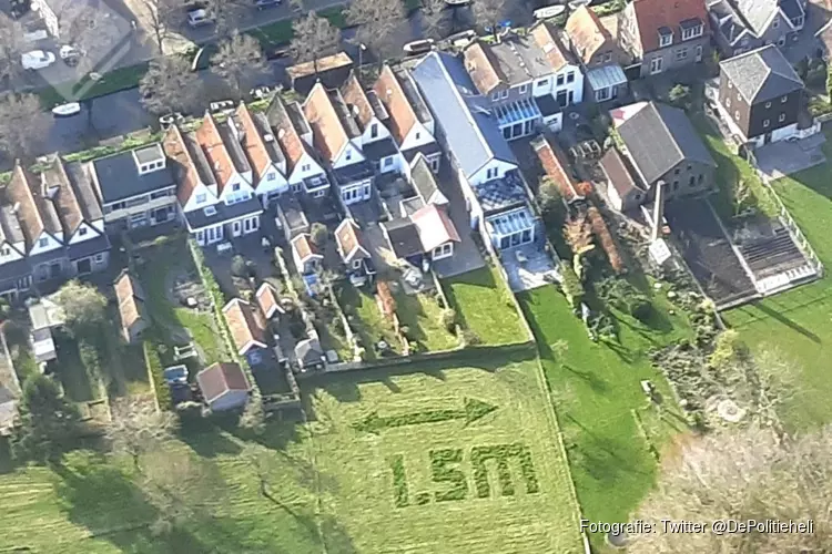 ENKHUIZEN - De politie spotte vanmiddag vanuit een helikopter boven Enkhuizen een opmerkelijk gemaaid grasveld. Hoewel de tekst niet op ware grootte is gemaakt, is de boodschap glashelder: houd anderhalve meter afstand van elkaar.