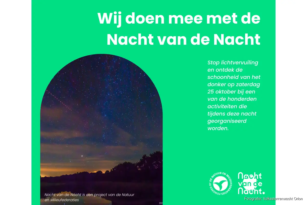 De Nacht van de Nacht is een jaarlijks evenement georganiseerd door Natuur en Milieufederatie. Tijdens de Nacht van de Nacht worden er door het hele land evenementen georganiseerd in het donker. Daarnaast doven honderden bedrijven en gemeenten lichten van gebouwen en reclameverlichting. Dit jaar wordt de Nacht van de Nacht voor de 21e keer georganiseerd met honderden mooie activiteiten; meer info: www.nachtvandenacht.nl