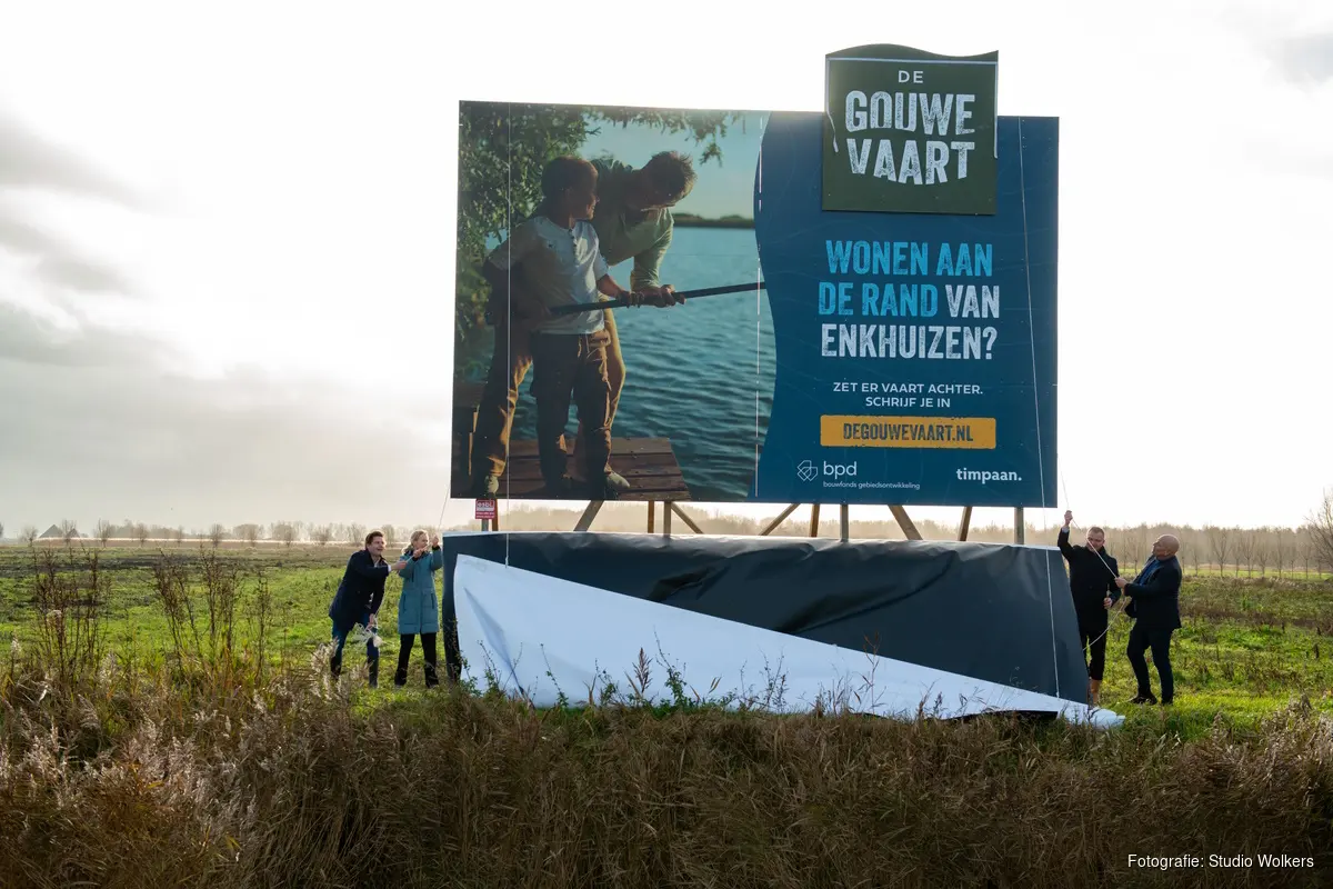 ENKHUIZEN - Met de onthulling van het bouwbord is officieel het startsein gegeven voor de ontwikkeling van de nieuwe woonwijk De Gouwe Vaart in Enkhuizen. Wethouder Jan Franx (SED) verrichtte samen met Bas Kalter (BPD | Bouwfonds Gebiedsontwikkeling) en John Noordeloos (Timpaan) de feestelijke handeling op de toekomstige bouwlocatie.