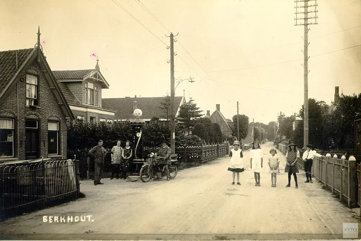 Foto-3: Berkhout omstreeks 1900. Links staat Piet Kool voor zijn garage, naast hem Frouwtje Kool-Bruggen en Bets Eilander. De man op de motorfiets is Willem Smit. In groepje kinderen onder andere Nelie Kommer, Annie Schmidt en Aaf de Haas. Naast de garage de dokterswoning en daarnaast het huis van Jan Maars Nierop.