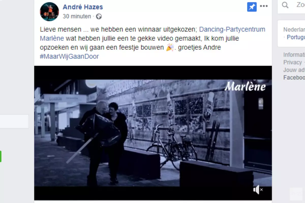 "Lieve mensen ... we hebben een winnaar uitgekozen; Dancing-Partycentrum Marlène wat hebben jullie een te gekke video gemaakt, Ik kom jullie opzoeken en wij gaan een feestje bouwen 🎉. groetjes Andre #MaarWijGaanDoor"