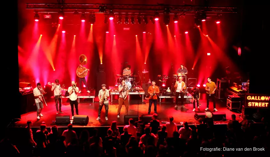 ALKMAAR – De eerste verjaardag van Podium Victorie op de locatie aan de Pettermerstraat te Alkmaar is vrijdagavond een bruisend feest geworden. Het verjaarspartijtje werd opgesierd door een gratis concert van Gallowstreet. Hoewel de kop van dit artikel uiteraard slechts figuurlijk is deed de Amsterdamse twaalfkoppige brassband het mooie nieuwe poppodium op z’n grondvesten trillen en werd het dak er bijkans afgeblazen.
