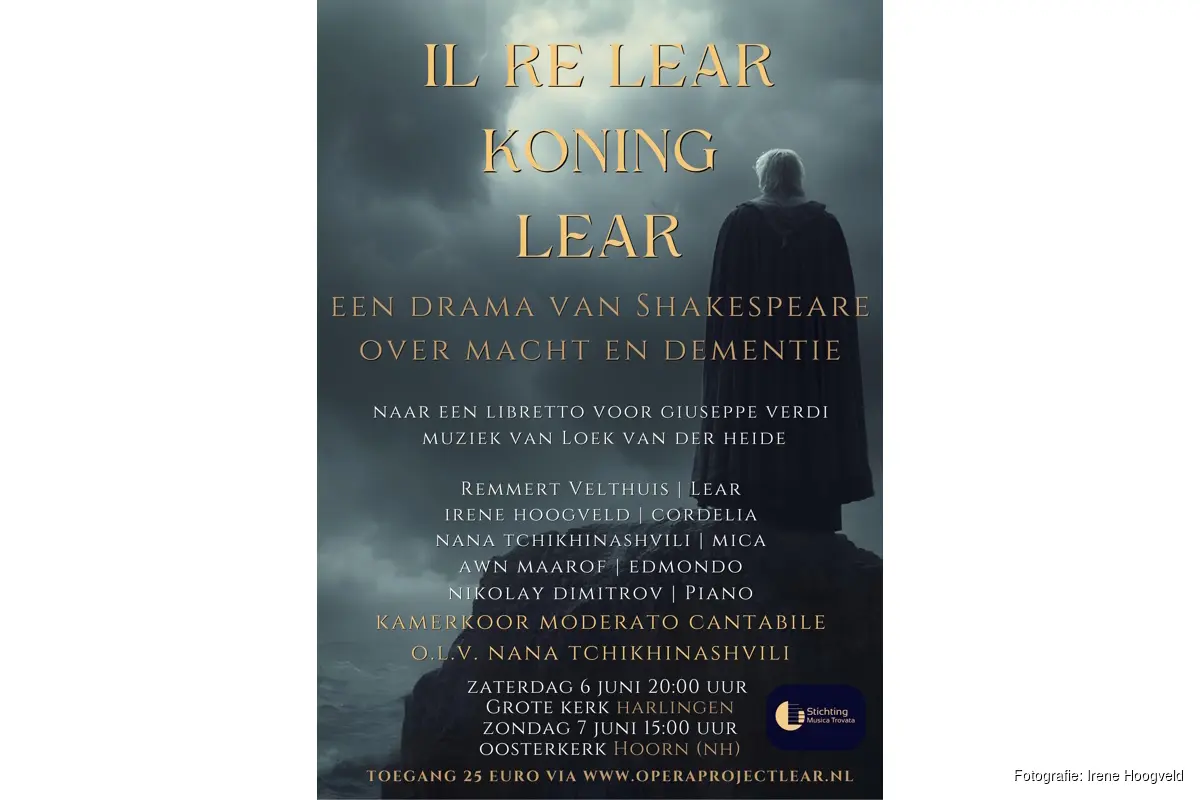 HOORN - IL RE LEAR is een bijzonder operaproject met nieuwe muziek van de Harlingse componist Loek van der Heide, gebaseerd op Shakespeare’s King Lear en geïnspireerd op Verdi’s nooit voltooide operaplan. Van der Heide geeft het bewaarde libretto een eigentijdse muzikale stem. De opera draait om twee krachtige thema’s: de strijd om de erfopvolging en Lears toenemende dementie, wat leidt tot familiedrama en verraad. Het dementiethema geeft het werk een actuele maatschappelijke lading. Liefhebbers van dramatisch muziektheater en wie zich betrokken voelt bij het thema dementie mogen deze uitvoering niet missen!